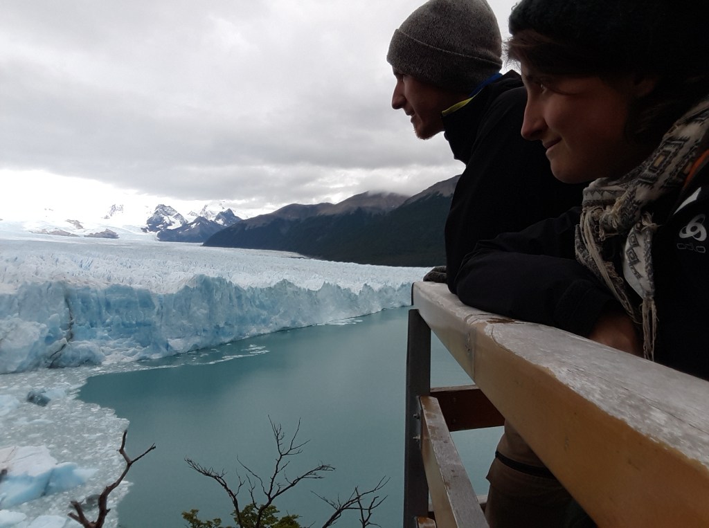 Évidemment on ne pouvait pas passer à côté de la visite du glacier le lendemain. Un bus nous dépose dans le parc national, au départ du sentier des passerelles qui longent la côte du Lago Argentino face au glacier (plus de 5km de passerelles !). Après avoir marché quelques minutes et avoir observé quelques blocs de glace à la dérive, nous voilà en face de la masse imposante du Perito Moreno. Un mur de glace de 50 à 70 m de haut, d’un bleu intense, comme flottant sur le lac. On entend les craquements de la glace. Et tout d’un coup, un morceau qui se détache !