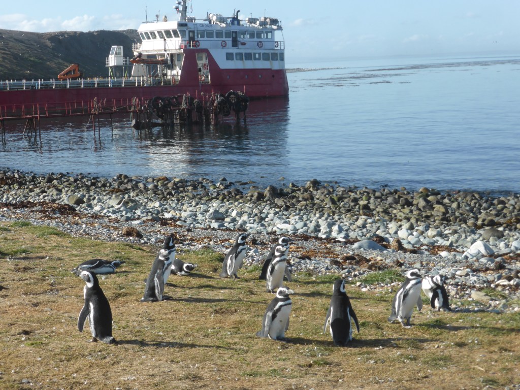Pour le premier jour ce sera direction Isla Magdalena au large de Punta Arenas. L’objectif est d’aller observer les Manchots de Magellan. Un trajet de 1h30 en bateau calme et à l’approche de l’île, encore des dauphins ! Un peu différents des précédents car plus sombres. On commence alors à être blasés des dauphins… 😉