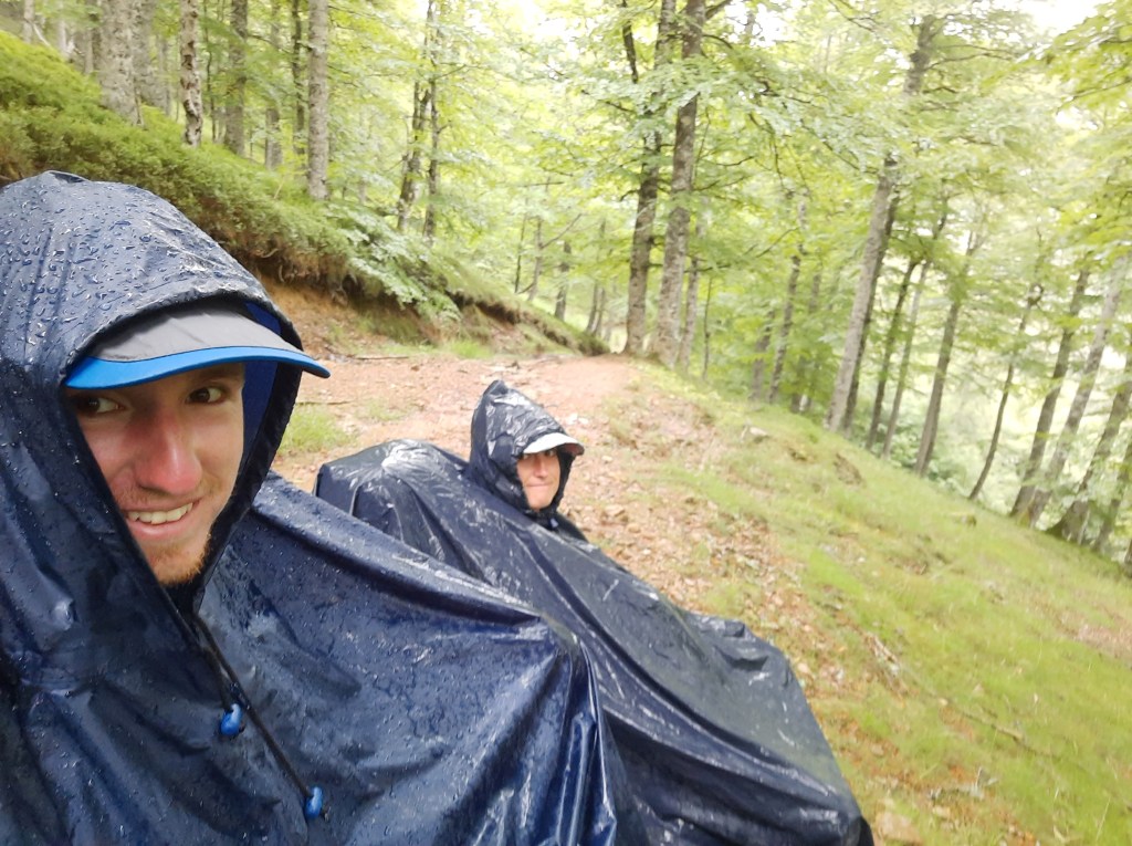 On finit par arriver au lac d’Iraty, qui en fait n’existe plus. Il n’est même pas 16h et on est presque arrivé à notre destination du jour ! Mais c’était sans compter sur la pluie qui nous rattrape… L’orage gronde et on décide de s’asseoir sous un arbre, à l’abri des ponchos, en espérant que ça passe.
