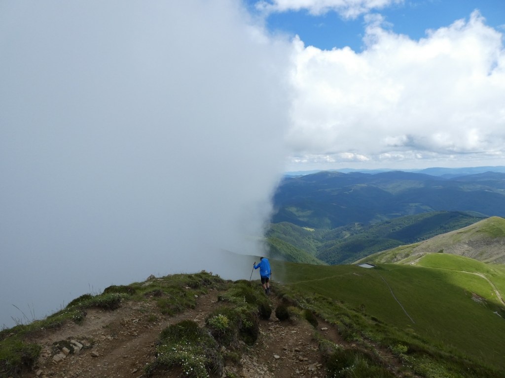 Passage après 45 min de marche aux chalets d’Iraty où l’on peut se ravitailler à la petite épicerie et récupérer un peu de réseau dans la salle-cafet’. On repart ensuite vers le col de Bagargiak où l’on quitte le GR10 pour basculer sur la HRP via un bout du GR transfrontalier et des sentes diverses. Le brouillard s’installe, et premier couac quand on se rend compte que l’on a pas bifurqué assez tôt sur le sentier. Obligés d’improviser et de couper à travers pente dans la prairie pour rattraper le chemin… mais rien de méchant.
