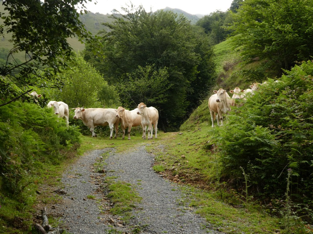 On a maintenant trouvé notre rythme en se levant à 7h30 tous les matins (un peu tard pour Loïc mais un peu tôt pour Maroussia). Pliage du matériel sous les nuages basques avec quelques timides rayons de soleil, petit déjeuner au réchaud sur la terrasse du gîte et c’est reparti ! Au bout d’un moment nous nous retrouvons confrontés à un problème encore inconnu jusque là : un troupeau de vaches au milieu du chemin.
