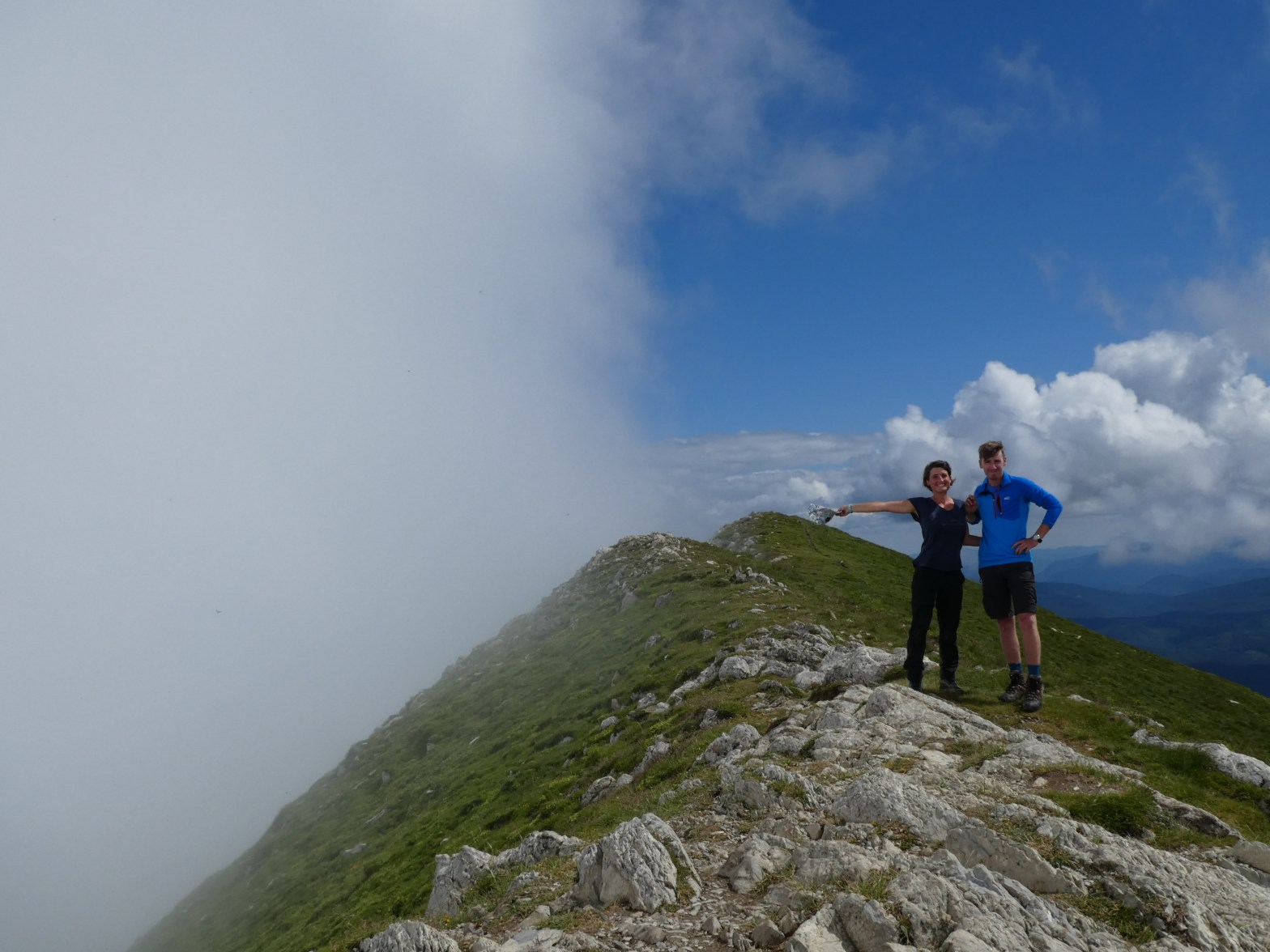 On pique nique au pied du Pic d’Orhy au col de Thartaphünta. Puis on grimpe raide en direction du pic, montée plutôt pénible dans la boue et sous des averses régulières. Passage par les crêtes d’Alupegna puis arrivée au sommet à 2017 m (premiers passages à « 2000 » de la traversée). Maroussia n’est pas rassurée par les sentiers abrupts, Loïc plutôt par la peur que l’orage nous tombe dessus.