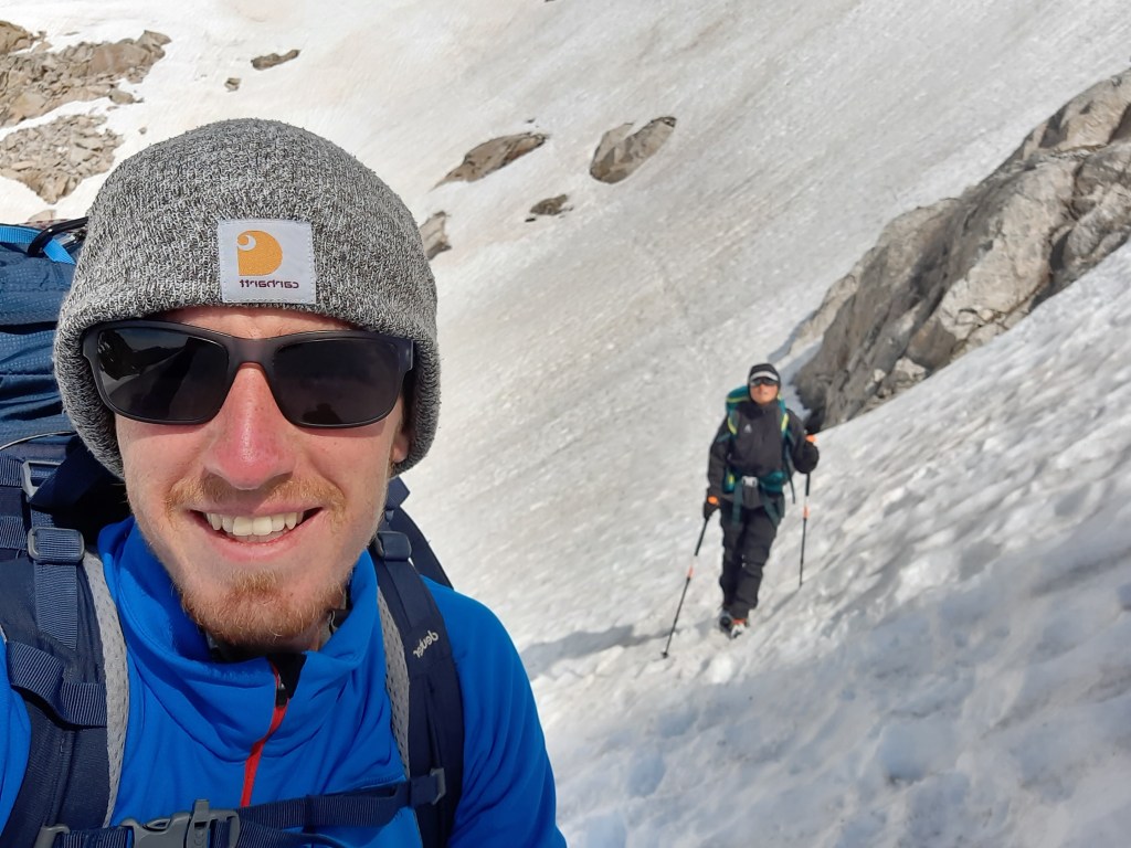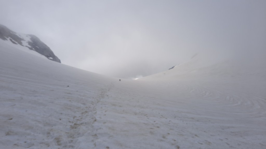 On chausse les crampons pour avancer sur le glacier et on s’enfonce petit à petit dans le brouillard qui nous fait face. On monte 500 à 600 m de dénivelé, premier cap le Montferrat puis le col à sur la droite. Les traces dans la neige sont faciles à suivre, heureusement car le brouillard nous tombe dessus vers la fin, elles nous emmènent jusqu’au rocher. va falloir « escalader » pour la montée finale.