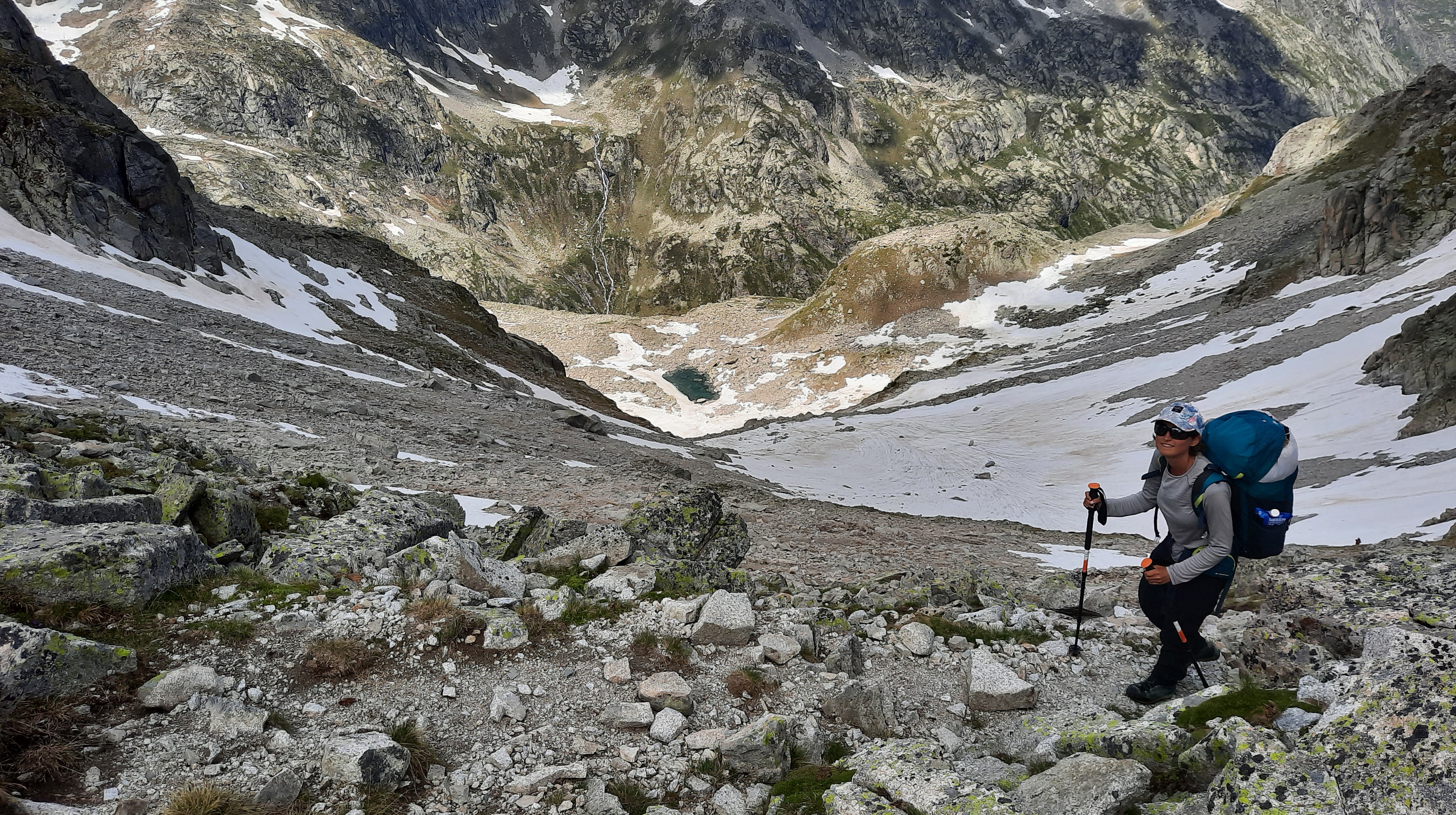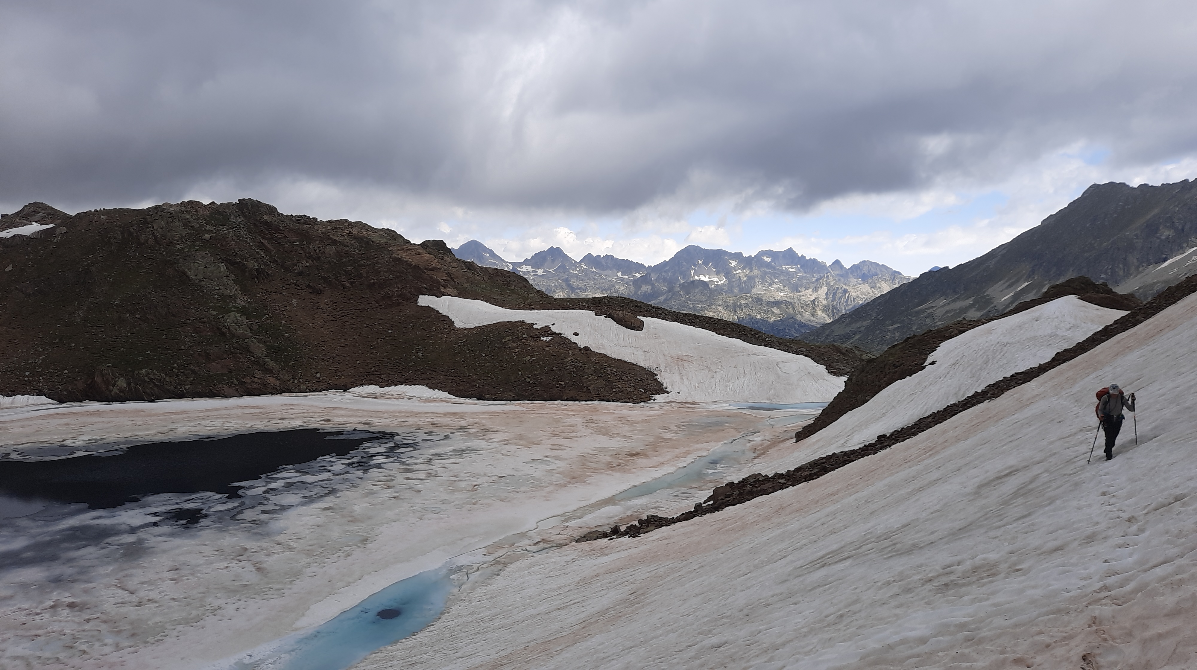 Nous partons par le vallon d’Arratille, direction les lacs puis le col. Quelques gros névés à passer sans difficulté puis on atteint le col.