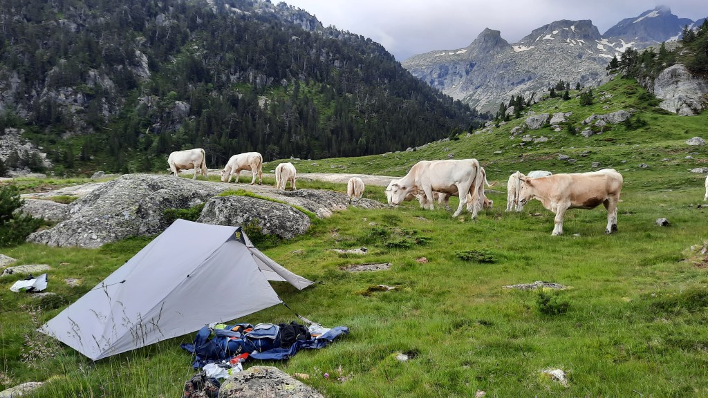 Réveil avec les vaches ce matin, la nuit a été calme mais un peu humide. Les nuages sont bien accrochés sur les cimes.