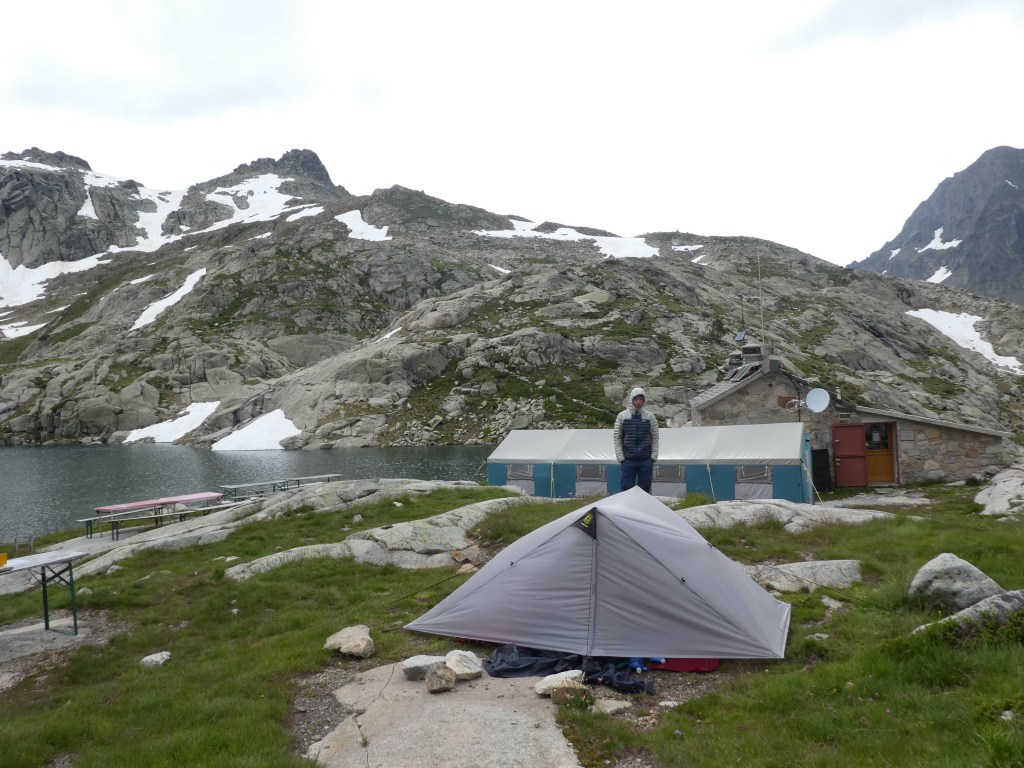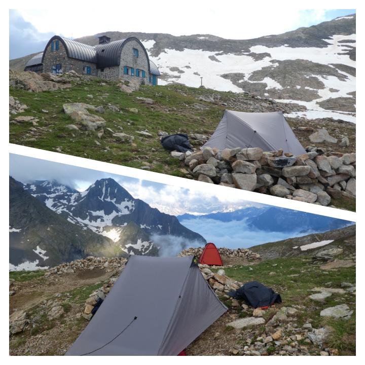 Arrivés au refuge assez tôt (tant mieux vu qu’ils annonçaient des orages), on se présente au gardien Éric. Nous avions prévu de bivouaquer à côté et de prendre les repas au refuge, on trouve donc un emplacement qui nous convient sur le tout petit espace dédié au bivouac.