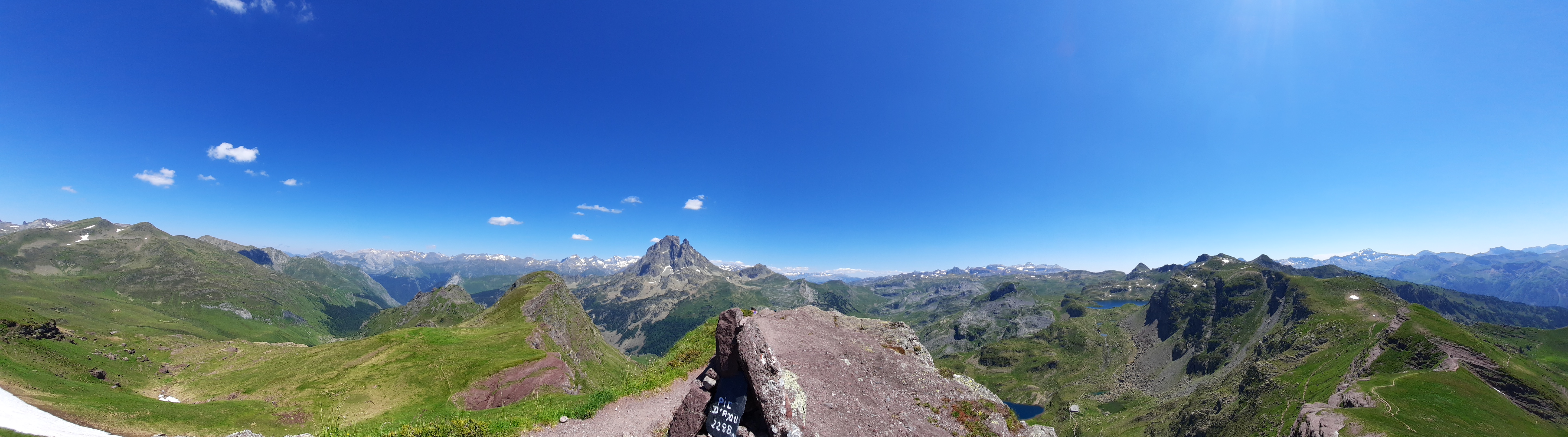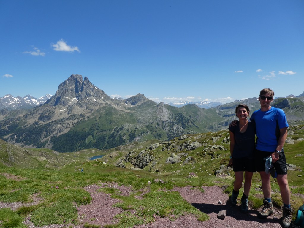 Nous repartons en direction du col d’Ayous. Et à l’arrivée au col, wahou ! Il y a une vue magnifique sur le pic du Midi d’Ossau, massif, rocheux, dominant les Lacs d’Ayous au pied du col.