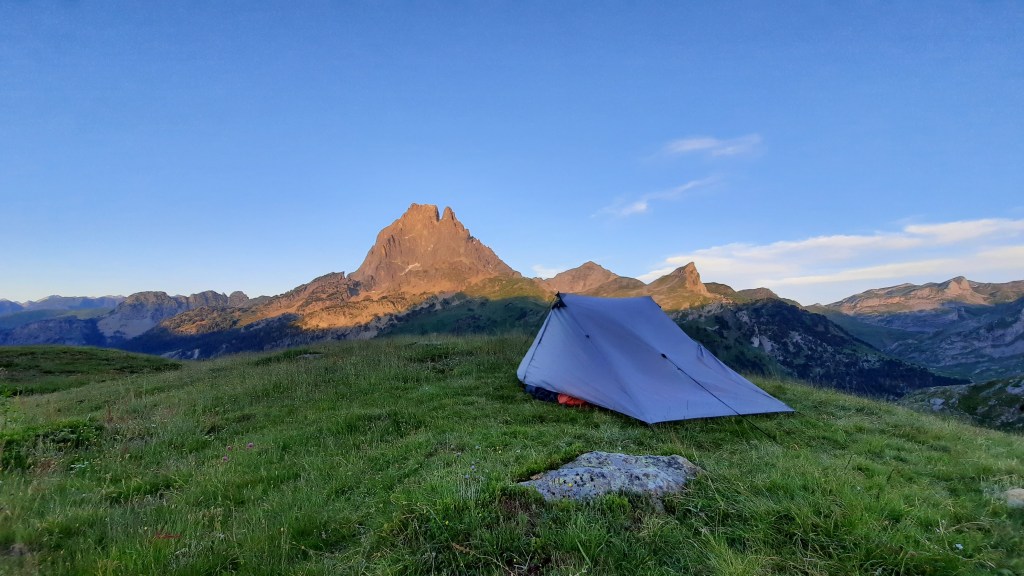 La vue que l’on a depuis la tente est vraiment splendide, le Pic du Midi d’Ossau d’un côté, le lac de l’autre. On n’avait pas encore bivouaqué à un endroit avec une si belle vue !
