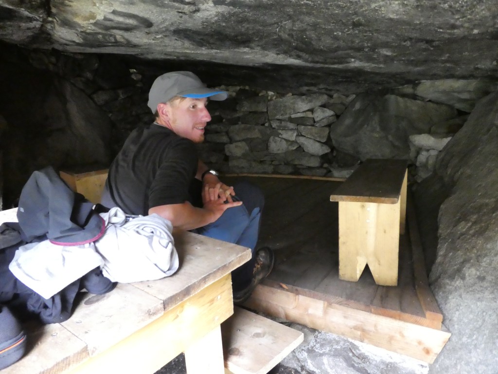 On commence à marcher assez tard ce matin (il a fallu aller faire les courses et finir le dernier article de blog), la journée est très belle mais il fait très chaud. La montée bien raide nous mène en 2h30, pile pour l’heure du manger, au refuge de Larry qui est vraiment top ! Cabane petite mais très accueillante, lits propres, une source à l’entrée, placard avec des ustensiles de cuisine et un peu de nourriture diverse, et même une petite plaque gaz !