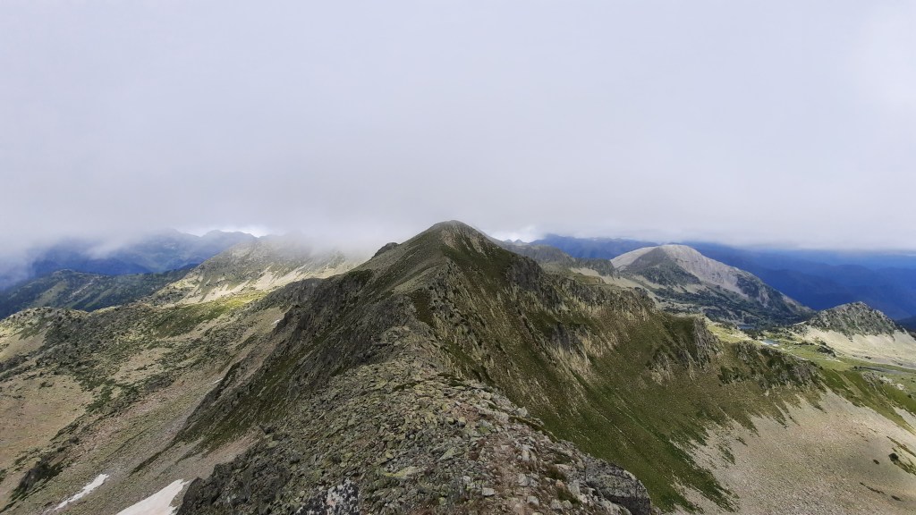 On se dirrige ensuite vers les étangs de Bacivèr, d’abord le « baish » puis ceux « del naut ». Le brouillard nous enveloppe alors créant une atmosphère étrange. On grimpe vers les Tucs « Rosari de Bacivèr » et « Marimanha », tout droit dans la pente, heureusement avec le brouillard ça passe vite. Difficulté sur cette portion : il n’y a pas de sentier et les cairns sont très très rares, il faut faire appel à nos talents de pisteurs ! Nous finissons l’ascension par les crêtes et nous avons la chance que le brouillard se dégage une fois que nous sommes au sommet.