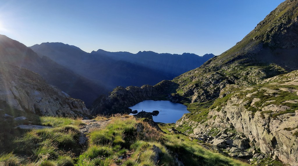 Réveil en surplomb du lac avec les pointes ensoleillées en face ! On se dirige vers le vallon du Picot en restant au frais de l’ombre matinale.
