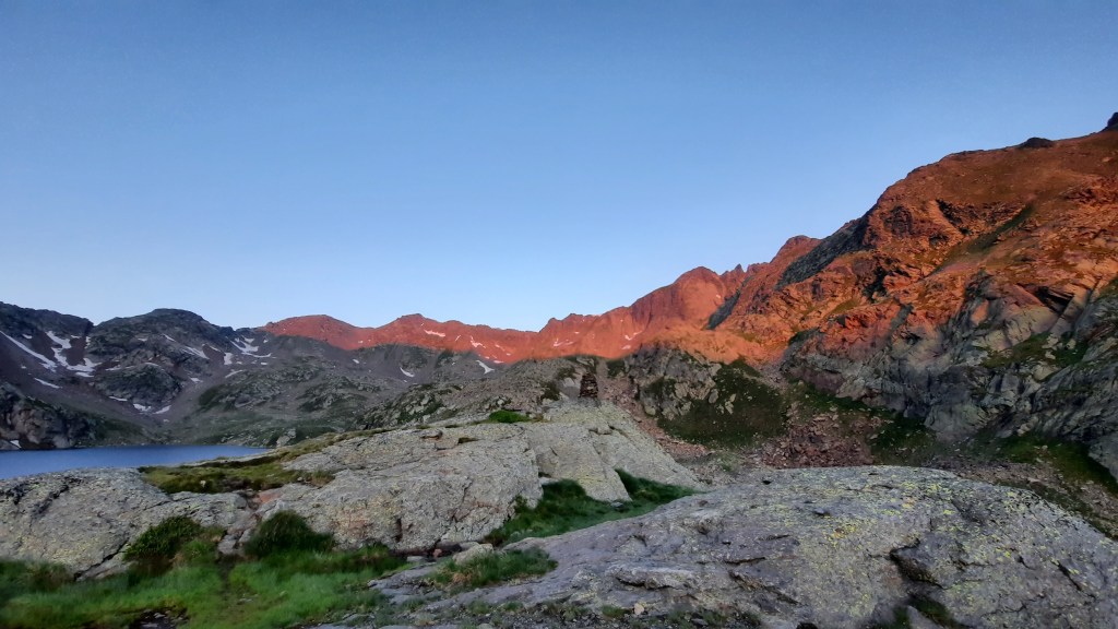 Heureusement la dernière descente jusqu’au refuge est magnifique ! Elle passe dans un vallon dominé au Nord-Ouest par le Mont Roig, parsemé de lacs successifs et de banquettes rocheuses rouges où serpentent des méandres de torrents. Le tout sublimé par la lumière décroissante du soleil couchant. Cela permet de faire passer plus vite cette dernière heure de descente.
