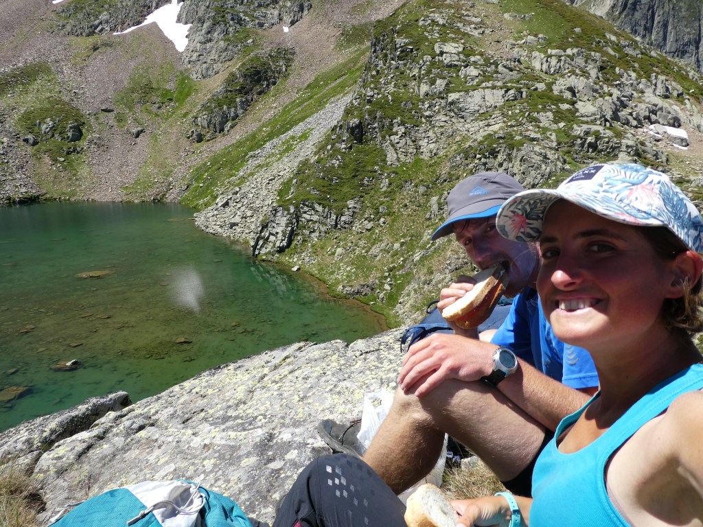 Finalement, au col on aperçoit les lacs et la cabane orange pétard d’Airoto (que nous avions repérée déjà de bien plus loin grâce à sa couleur) ; on bifurque alors dans la pente pour y arriver. On s’accorde à qualifier cette portion de longue et chiante pénible, car il faut descendre pendant 1h30 dans de gros éboulis/blocs entassés. C’est marrant au début de se déplacer d’un rocher sur l’autre, mais au bout d’un moment on n’en peut plus (surtout Maroussia) !