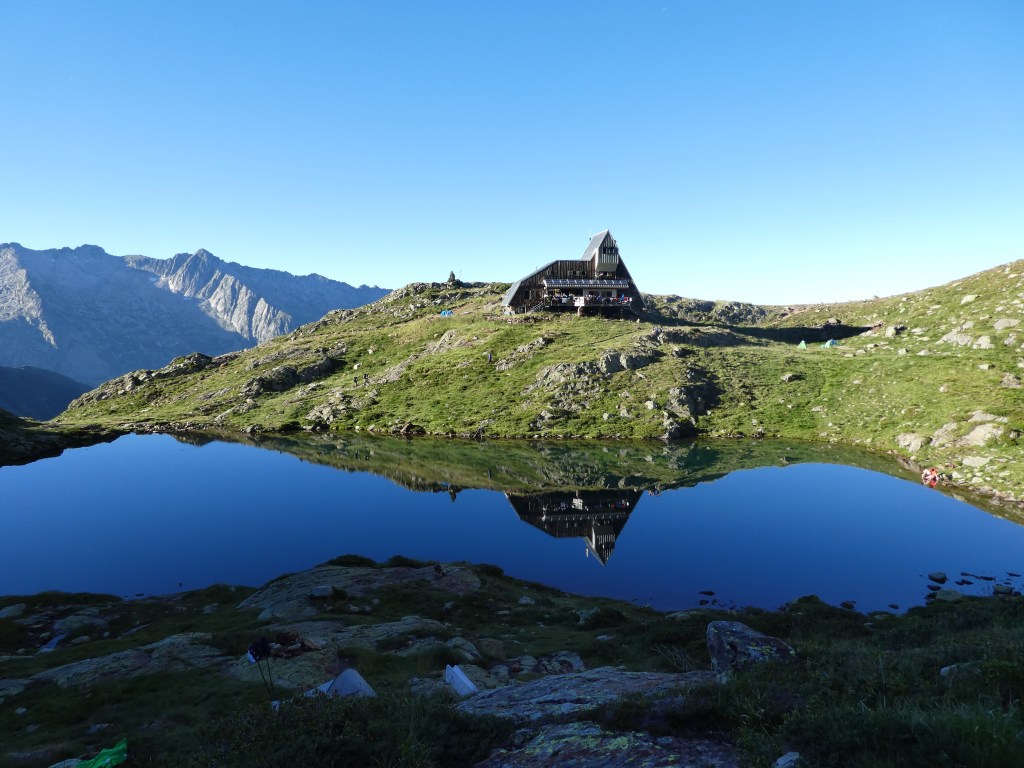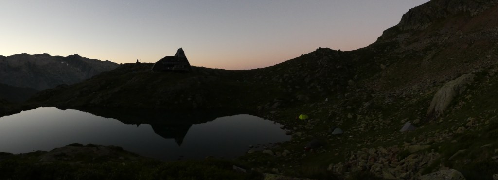 Finalement on longe le plus grand des lacs et après l’avoir cherchée un peu, on arrive à la mignonne cabane d’Airoto ! Enfin ! Heureux d’y être, le coin est superbe, et on profite des derniers rayons de soleil au-dessus des crêtes en mangeant notre bonne soupe du soir.