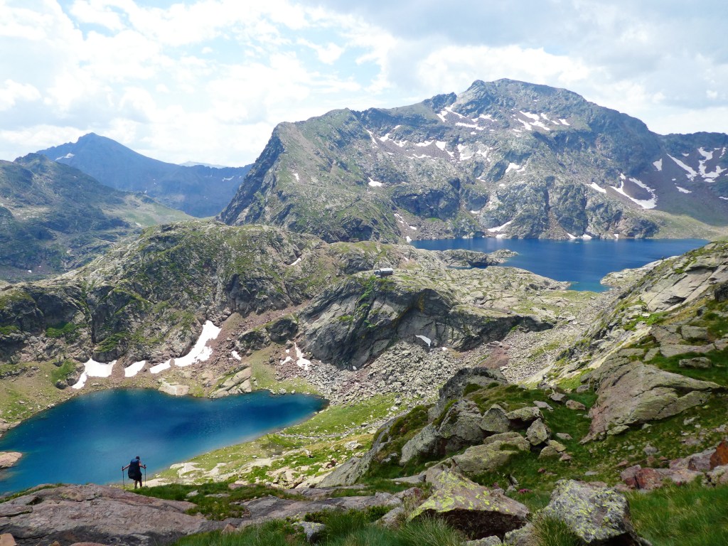 Passage de 2 cols successifs offrant une belle vue, l’un sur les pics faits la veille, l’autre sur les lacs côté étang Fourcat. On finit par la descente au refuge.